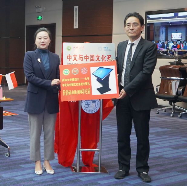 随后,三一一大学余努思副校长与西华大学费凌副校长分别代表两校为中文与中国文化系揭牌,费凌副校长同时代表西华大学向三一一大学赠送了贺礼,祝愿中文与中国文化系越办越好,未来两校合作能结出硕果!
