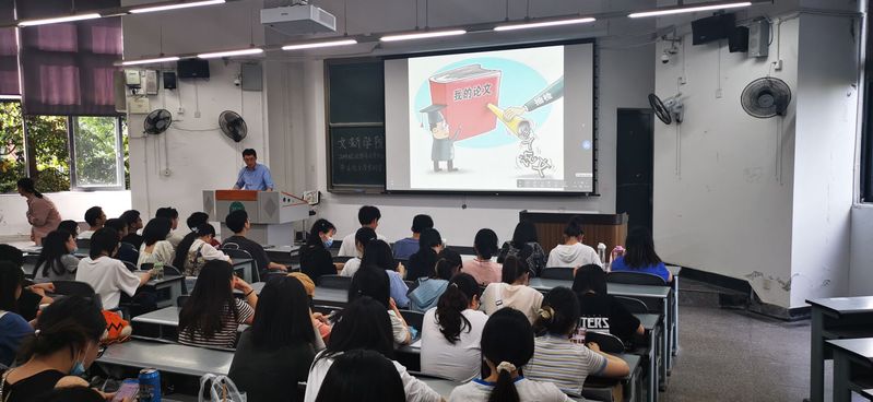 王燕飞老师强调了毕业论文的规范性与严肃性,他从省级抽检基本程序、抽检结果分类、抽检结果具体分布与四川省本科毕业论文(设计)抽检评议要素四个方面对于毕业论文的要求进行了细致讲解,敦促同学们端正态度、踏实做学。并提出了尽早准备、补充阅读、尽量与考研方向结合的相关建议。