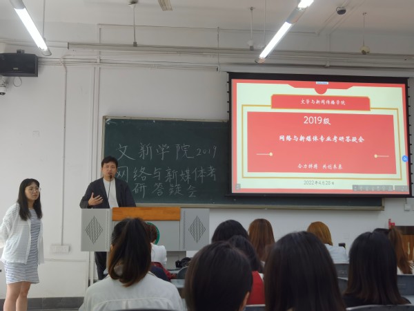 4月28日,2019级网络与新媒体专业举行了考研答疑会。传媒系副系主任乔晓英,教师陈海燕、耿姝、叶茂、刘洋、侯梦瑶、康馥,辅导员陈柄志和丁秦、侯佳佳、蔡沛言3位2018级成功升学的同学就考研相关问题为同学们进行详细讲解与具体指导。