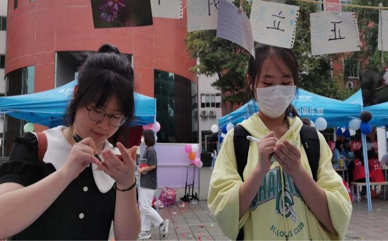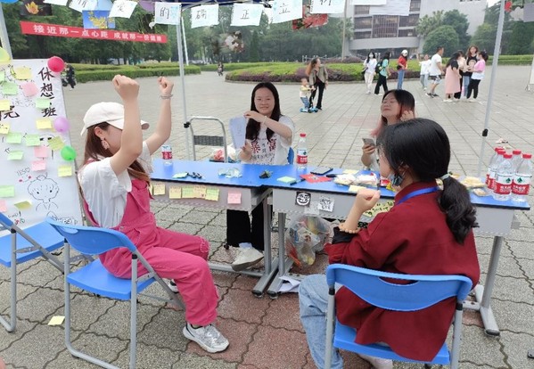 活动开始后,摆点展位前人流涌动,获得了同学们的积极关注。很多同学们在便签上写下在自己对爱情的困惑或看法,同时也积极参与现场准备好的心理小游戏。在写自己的爱情观时,同学们认真思考,并学习其他同学的积极的爱情观,针对大家关注的恋爱话题,我们也和参与同学们一同积极讨论。在游戏环节,现场氛围轻松,同学们通过在规定时间内背诵要求诗词、头脑风暴成语版、你来比划我来猜等三个游戏赢得小礼品。活动结束后,纪检部成员打扫现场卫生,将器材搬回办公室,并进行了活动总结。