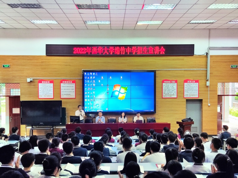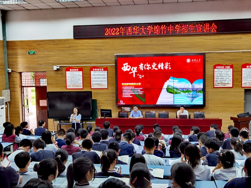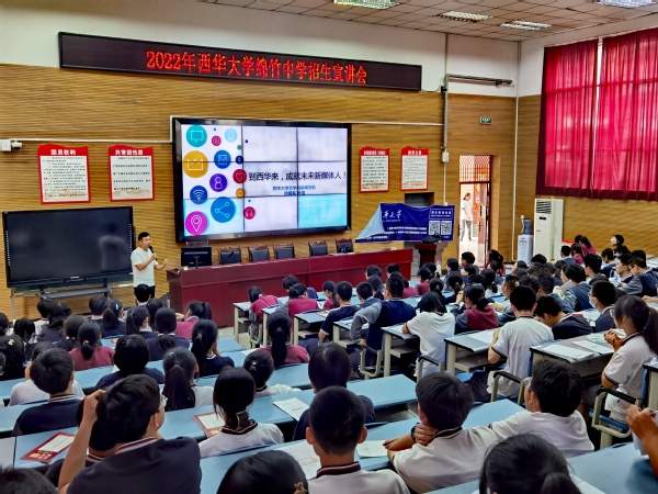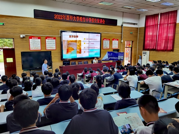 随后,在绵竹中学精心安排下,学院几位专家为近200名高二学子进行了招生宣讲,推荐西华大学,推介文新学院。宣讲会由徐攀主持,王莉以“西华有你更精彩”为主题,向学生全面介绍了西华大学概况。王燕飞、叶茂分别以“大学里的文学活动”、“到西华来,成就未来新媒体人”为题,向学生作了富有激情的宣讲。徐攀介绍了西华大学及文新学院近年招生录取情况,鼓励高二学子加油努力,充满信心迎接未来。