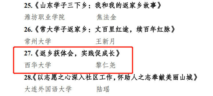 以黎仁尧为代表的实践团队以“返乡获体会,实践促成长”为主题开展了系列“三下乡”社会实践调研。他们走进乡村,感知民情,关爱留守儿童,关心农村发展,加快乡村振兴落地落实,为乡村振兴贡献青春力量,书写了乡村振兴战略中的青年西华学子力量。
