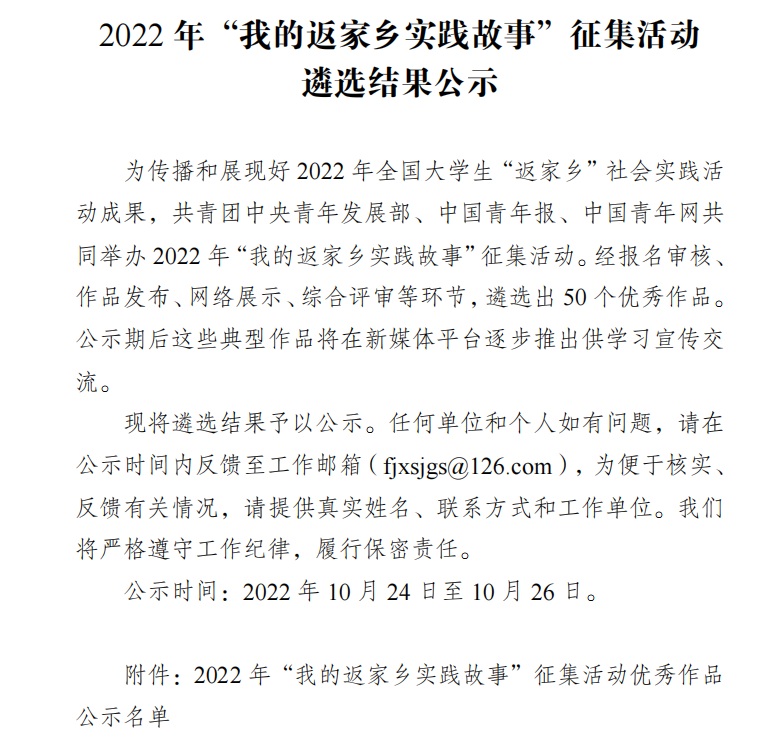 (图1 共青团中央组织“我的返家乡实践故事”遴选结果公示)