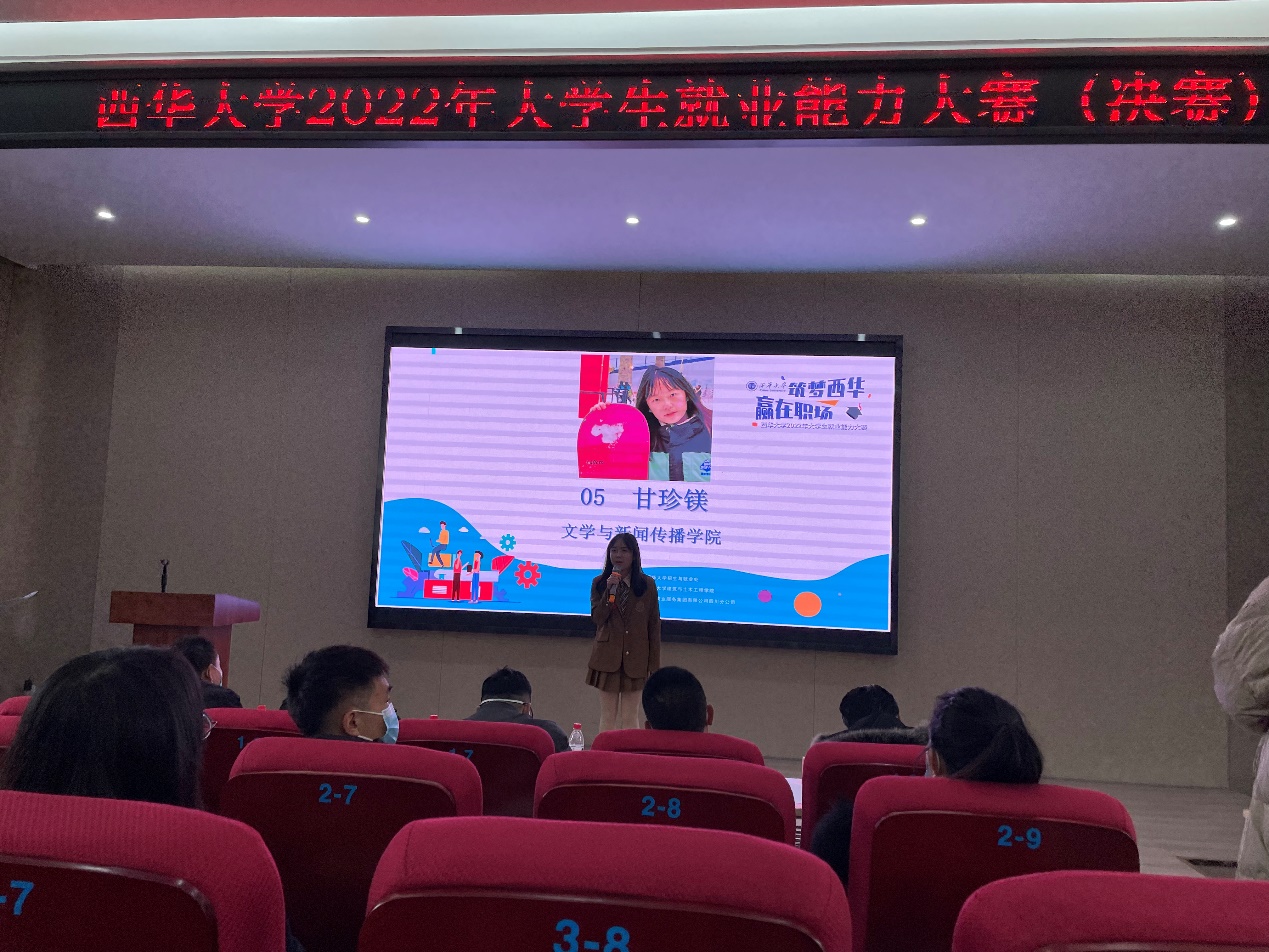 12月13日,西华大学2022年大学生就业能力大赛决赛在第一教学楼1B303报告厅举行。本届大赛分为校内初赛和复赛、决赛。在初赛环节学院精心组织,推荐初赛表现优异学生参加学校复赛,经过复赛评选,我院2020级汉语言文学专业甘珍镁以第三名进入决赛。
