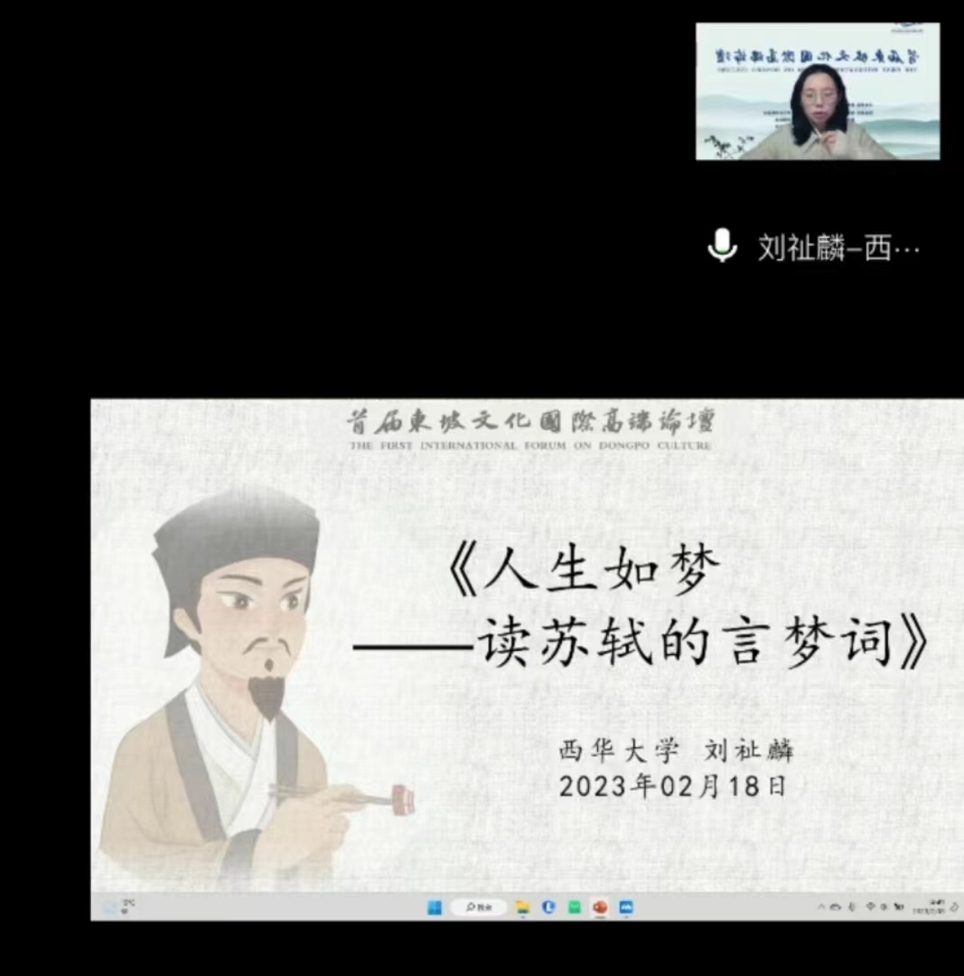 学院2022级中国语言文学专业研究生刘祉麟同学在线上参加了苏轼文学论坛的研讨,通过聆听与会学者发言,得到很多启示。刘祉麟同学在分论坛上作了题为《人生如梦——读苏轼的言梦词》的交流发言,她指出:在苏轼流传至今的300多首词中,“言梦词”共有61首,占比很大,于是以苏轼的“言梦词”为研究对象,从儒释道思想、“梦”主题及苏轼生平遭遇和心态变化三个方面对苏轼写作“言梦词”的原因进行了探究。
