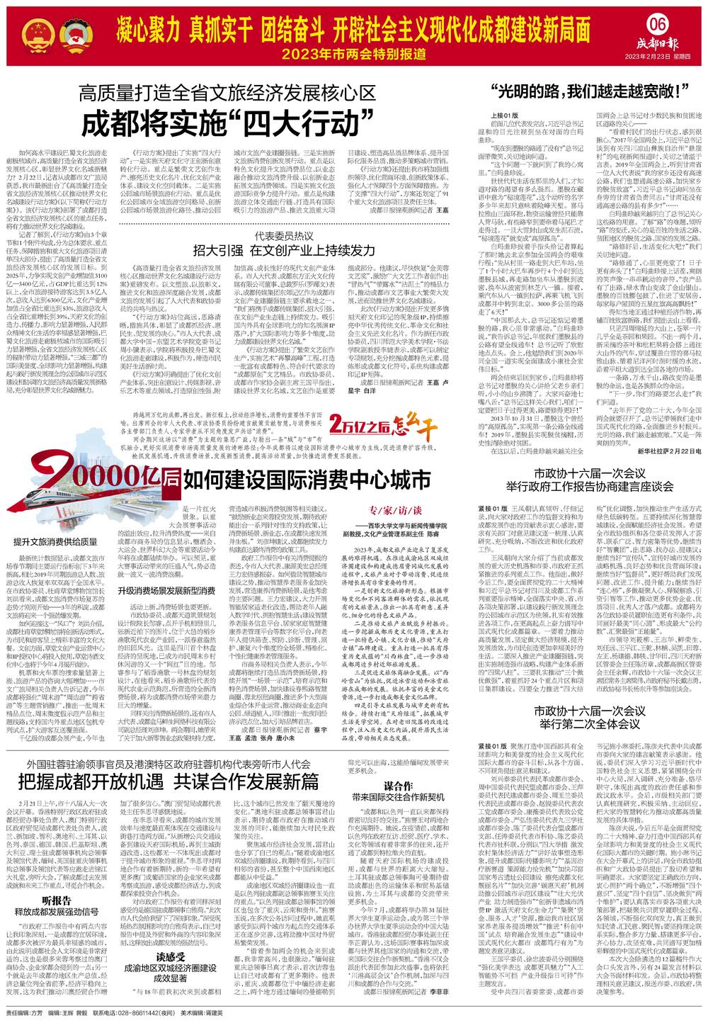 2月23日,成都日报第六版《凝心聚力,真抓实干,团结奋斗,开辟社会主义现代化成都建设新局面——2023年市两会特别报道》刊发了对我院文化产业管理系教师陈睿副教授的“专家访谈”。就如何促进成都文旅产业发展,激发消费活力进行采访报道。
