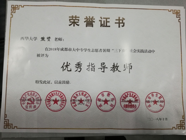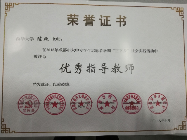 10月30日,2018年成都市大中专学生志愿者暑期“三下乡”社会实践活动成果展示暨工作总结会在成都大学召开,人文学院团委书记熊贤、团委副书记陈艳荣获优秀指导教师,其带领的“逐梦盛夏”暑期社会实践团被评为优秀团队。