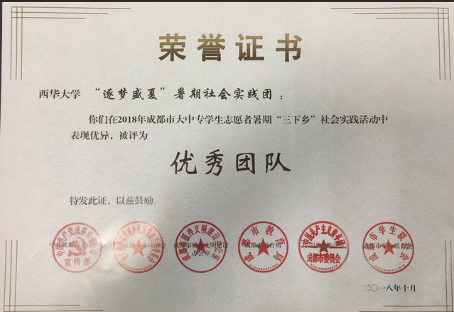 7月4日,熊贤、陈艳带领“逐梦盛夏”队赴郫都区唐昌镇横山村,开展以“弘扬乡风文明,助力乡村振兴”为主题的2018年暑期“三下乡”社会实践活动。活动期间,小分队主要开展了走访调研、爱心支教、问卷调查、主题讲座等活动。队员们各展所长,通力合作,获得当地领导和村民的高度评价。活动结束后与横山村村民委员会签署了共建大学生社会实践基地协议书,并收到他们的感谢信,取得了此次“三下乡”社会实践活动的圆满成功。
