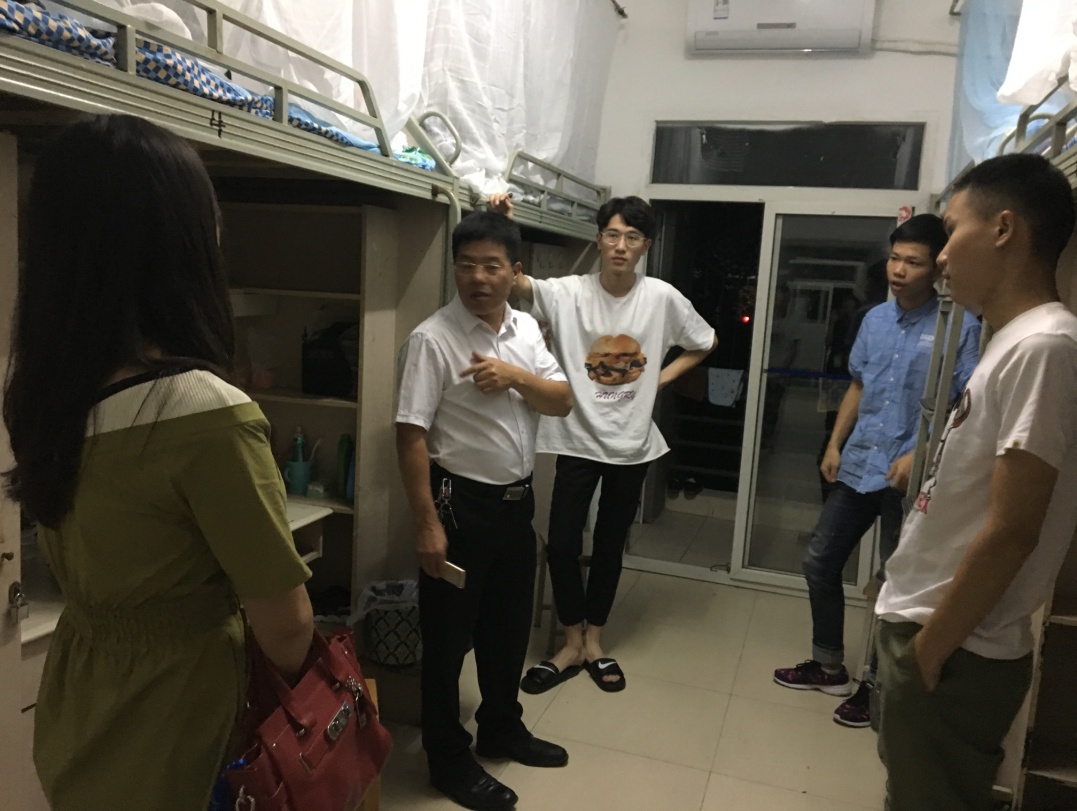9月6日晚8:00,人文学院党委书记兼副院长徐元彬、院长谢应光、党委副书记兼副院长徐攀、副院长王学东、范佳及有关辅导员深入新生宿舍,走访慰问2017级新生。