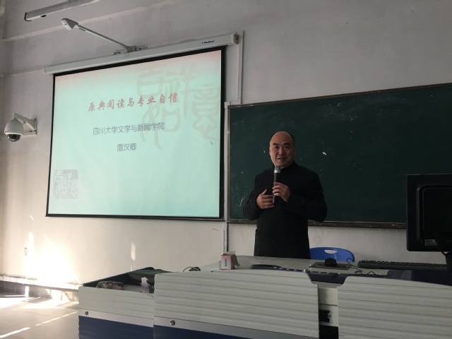 应人文学院邀请,四川大学文学与新闻学院副院长雷汉卿教授于3月27日莅临“人文新视野”学术讲坛,为我院汉语言文学专业师生带来一场题为《原典阅读与专业自信》 的高水平学术讲座。