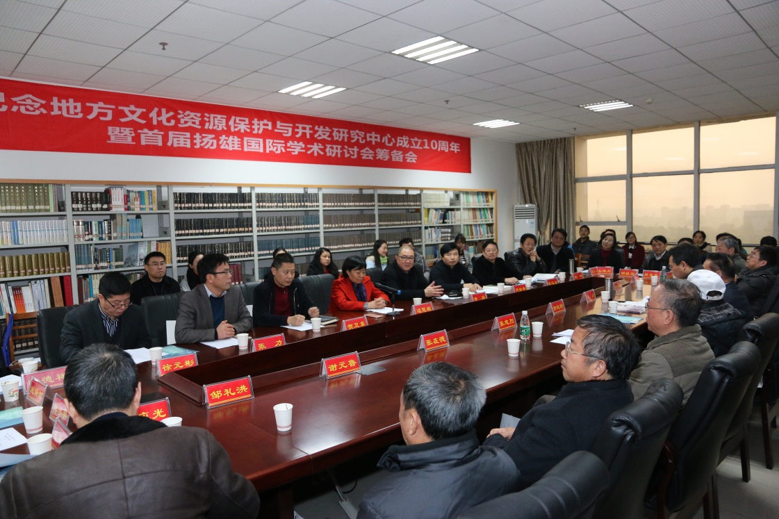 12月2日下午,我校在图书馆召开纪念地方文化资源保护与开发研究中心成立10周年暨首届扬雄国际学术研讨会筹备会。学校党委书记边慧敏、学校原党委副书记曾德祥、四川省社科联规划评奖办公室主任黄兵、郫县县委宣传部常务副部长贺卫东、郫县社科联秘书长肖诗杰、地方文化中心学术委员、学术顾问及校内外相关专家学者以及学校宣传部、科技处、发展规划处、图书馆、学术期刊部负责人和人文学院、地方文化中心的相关领导等50余人参加了会议。