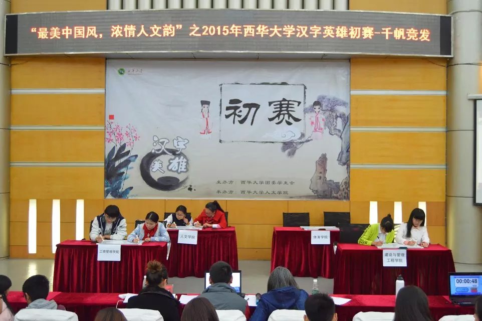 11月15日晚上,由西华大学校团委学生会主办、人文学院承办的2015汉字英雄大赛初赛在四教报告厅举行。人文学院团委书记兼2015级辅导员秦婷,中文系老师吕蒙、王庆担任此次大赛的评委。学校各学院派代表队参加了比赛,主持人由人文学院练鹏翔和严鑫同学担任。