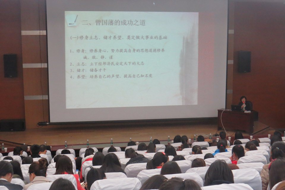 “他被冯友兰誉为‘阻止了中国倒退'的人,被毛泽东奉为‘独服'之人”,肖敏老师借用后代伟人对曾国藩的评价,拉开了本次讲座的帷幕。首先,肖敏老师对曾国藩的家庭及少年事迹做了简要介绍。她通过生动的历史小故事,幽默的语言,并联系大学生实际情况就 “曾国藩的成功之道”进行重点讲解:修身立志,储才养望;抓住机遇,做大做强,让事业蓬勃发展;功成后不居功,谦退自抑,平安渡过政治的险滩。肖敏老师说:“曾国藩官途顺利,成为对中国影响最大的人物之一的原因,在于他身居朝廷高位,还能够严格要求自己,每日进行自我反省,总结成败之因。”