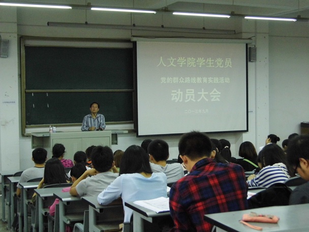 9月11日中午,人文学院学生党员“党的群众路线教育实践活动动员大会”在6B108召开。学院党委书记王大清、党委副书记兼副院长张雪征、专职辅导员以及学院全体学生党员参加了大会。大会由学工办主任兼党总支部书记徐攀老师主持。