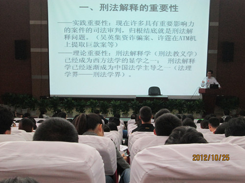 魏东教授首先从理论和实际两个方面为同学们讲解了刑法解释的重要性,通过各种真实事例从正反两方面论证,为同学们详细讲解了解释对象、解释理性以及学术之争三者的关系。随后,魏东教授指出现代社会面临的一系列问题,即司法逻辑与生活经验二者之间的一致性和矛盾性。其矛盾性体现在立法不当导致违背社会经验、立法漏洞填补及观念错位。同时提出这一矛盾性问题的解决方案,即完善立法和坚持民权主义刑法观。在谈到创新之道时,魏东教授提出坚持保守的刑法解释立场,并简要阐释了这一学术意义。 讲座持续了一个多小时,魏东教授的精彩讲述赢得了同学们的阵阵掌声。同学们表示,魏教授的讲座使自己获益匪浅,也使自己对所学专业产生了更大的兴趣。