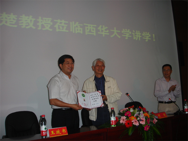 项楚先生对受聘为我院特聘教授表示非常高兴。他说,受聘为西华大学的特聘教授,以后就不是外人了。随后,项楚先生以《敦煌文化》为题开始了他作为西华大学特聘教授的第一次讲学。他从自己开始敦煌文化研究的经历讲起,介绍了敦煌文化产生的社会历史背景及其与佛教的关系、敦煌莫高窟壁画重要的思想艺术价值、敦煌文化对中国文学艺术的影响等。项楚先生的讲座深入浅出,通俗易懂,使在座师生对敦煌文化产生了浓厚兴趣,现场不时响起热烈的掌声。 讲座开始前,项楚先生还与人文学院的教师进行了座谈。他详细地介绍了自己的治学经验和感受,认真地回答了教师们有关学术研究等方面的提问,勉励青年教师要带着问题意识去读书和研究。作为我国著名的敦煌学家、文献学家、语言学家和文学史家,项楚先生在学界享有崇高的声望。他的研究领域以敦煌学为核心,涵盖了语言学、文学、文献学和佛学等诸多方面,其中对于敦煌俗文学的研究居于世界领先地位而享誉国际学坛。
