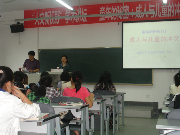 5月30日上午,应人文学院邀请,成都大学学前教育学院副院长卢伟教授给学前教育专业师生带来了一场题为《童年的秘密:成人与儿童的冲突》的精彩讲座,讲座吸引了人文学院广大师生包括一些家长的参与,整个6C--225教室座无虚席。副院长潘殊闲主持讲座。