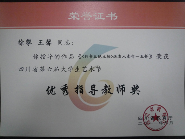 日前,从四川省第六届大学生艺术节传来喜讯,西华大学收获多个奖项。其中人文学院范国英老师的论文《大学通识教育人文素养课程教学方法改革初探》荣获“高校艺术教育论文”二等奖,王学东、谢应光老师的论文《中国新诗的文化内涵与“新诗教育”》荣获“高校艺术教育论文”三等奖,徐攀、王馨老师指导的学生宋彩萍的《〈行书五绝立轴〉送友人南行——王铎》荣获书法篆刻类(甲组)一等奖,同时徐攀、王馨荣获“优秀指导教师奖”。