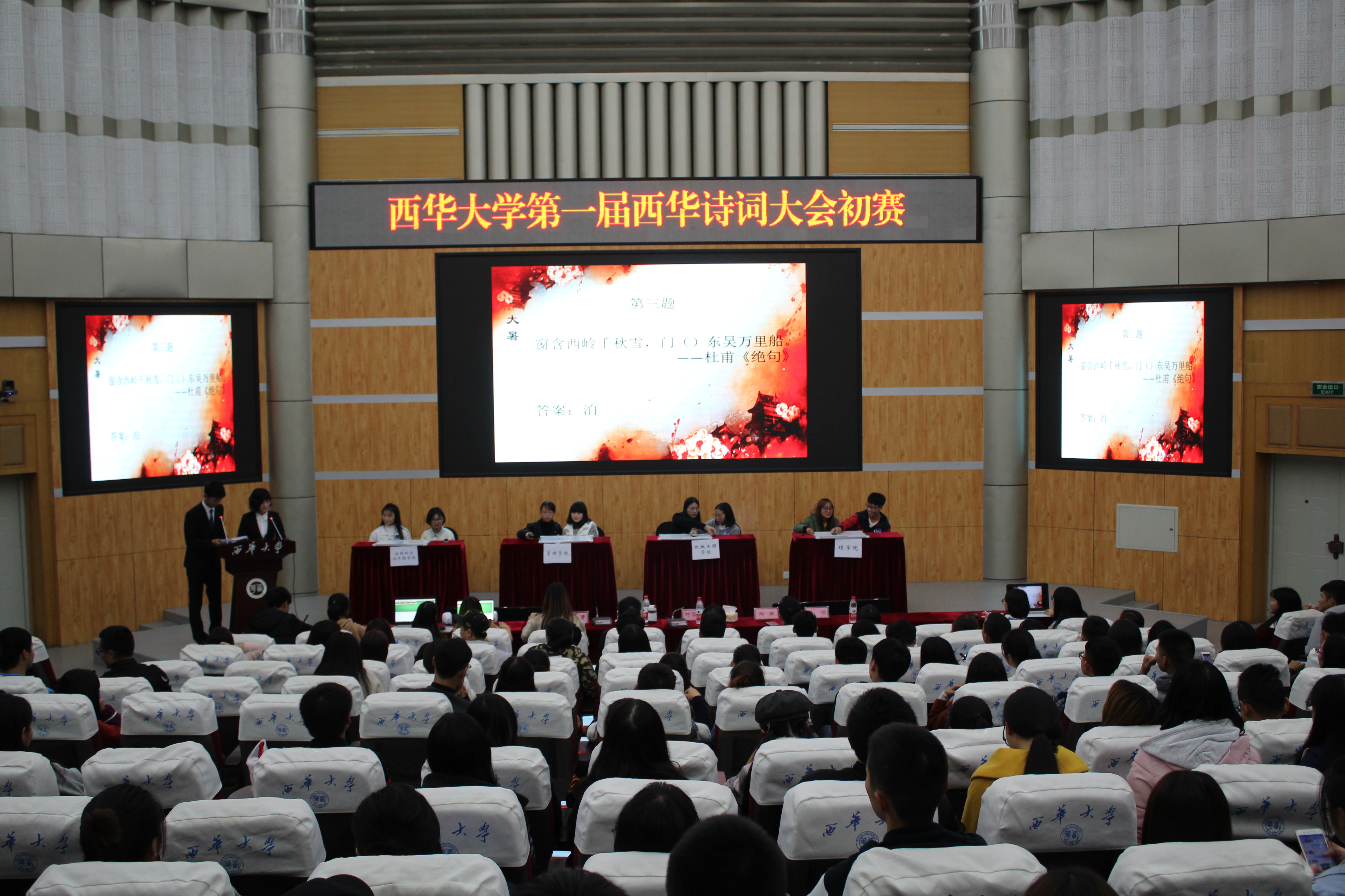 为传承中华优秀传统文化,进一步提高学生文化素养,11月12日晚,由共青团西华大学校团委主办、人文学院团委学生会承办的第一届诗词大会初赛——百川赴海在四教报告厅顺利举行。学校各学院派代表队参加了比赛,人文学院副教授王万洪以及熊贤、杨恒、刘文君老师担任此次大赛的评委。人文学院团委书记及主席团成员出席本次比赛。