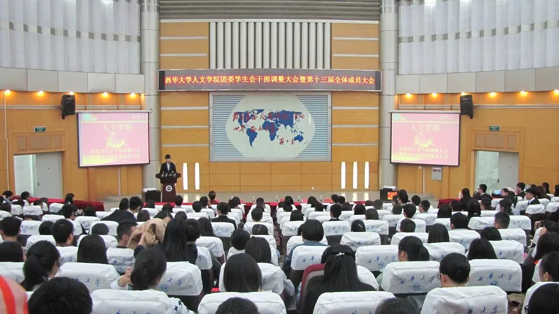 1030日中午1230人文学院团委学生会干部调整大会暨第十三届全体成员大会在四教报告厅顺利召开。出席此次大会的有学院党委副书记兼副院长张雪征,学工办主任兼学生党总支书记徐攀,团委书记秦婷,14级辅导员徐薇、罗策嫦,15级辅导员杨恒。受邀学院代表、学院第十三届团委学生会全体成员及各班班长团支书参加大会。主持人由学院组织部副部长左芳菁担任。