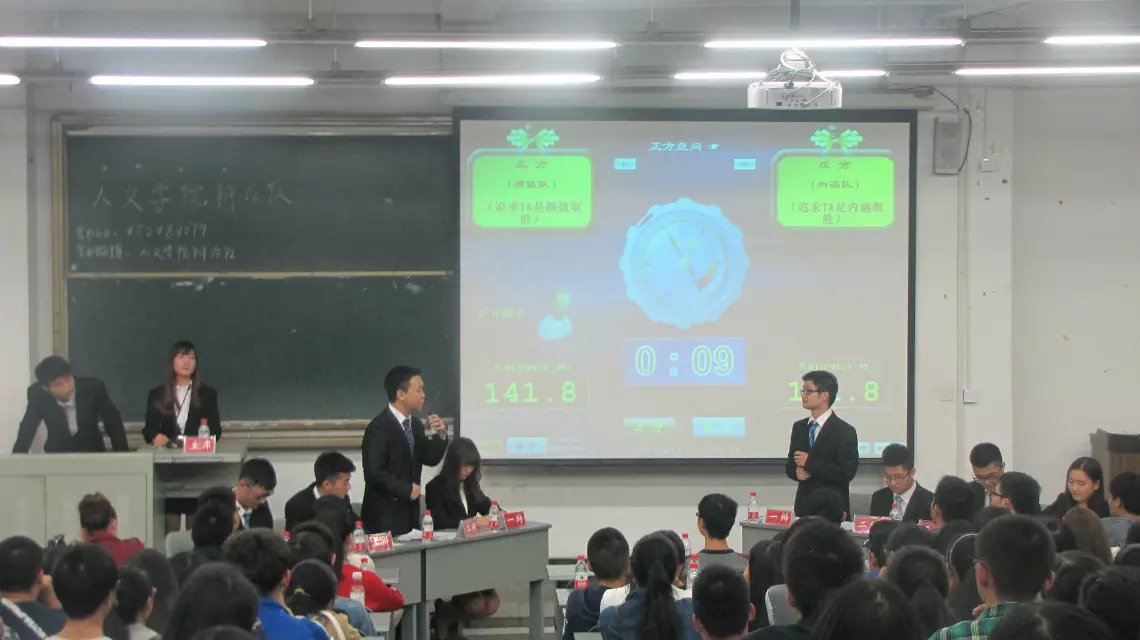 108日晚,人文学院辩论队在6B-107举办以“追求TA是靠颜值还是内涵取胜”为辩题的新生表演赛,2015级辅导员秦婷及各兄弟学院辩论队代表作为嘉宾列席旁听。