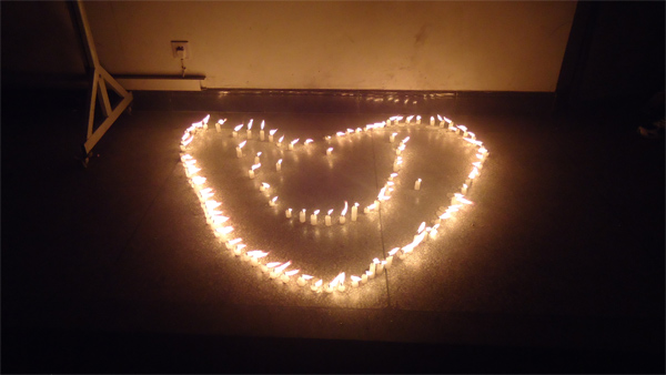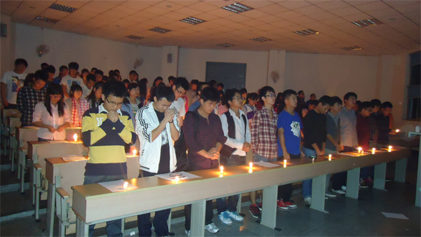 纪念活动分为两个环节。首先,全体同学观看了沉痛悼念汶川特大地震遇难者四川抗震救灾启示录两段视频资料。视频播放完后,每位同学点燃了事先准备好的蜡烛,全体起立默哀。三分钟后,同学们把手中的蜡烛放在地上摆成心形,在烛光中表达了对汶川地震遇难者的深切哀悼和怀念。