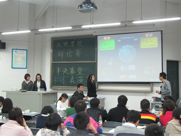 表演赛中,正方人文学院辩论队持“爱比被爱更重要”与反方材料学院辩论队支持的“被爱比爱更重要”开始了激烈的辩论。其中,在自由辩论环节中,双方辩手唇枪舌战,观众掌声欢呼声不断,现场气氛达到高潮。辩论表演赛的开展旨在给新生辩手们提供正确的指引,同时也加强了各学院辩论队之间的经验技巧交流。精彩的辩论表演赛之后,新生辩论赛半决赛正式拉开帷幕。半决赛共分两场,来自法学与管理双学位、学前教育和汉语言文学专业的四支队伍分别围绕“性教育是科学教育还是道德教育”、“新闻道德与青年道德哪个更重要”两个辩题展开激烈的争辩。其中以第三场舌战尤为精彩,正反双方准备充分、引经据典,古今史事相结合,在自由辩论中表现从容冷静,博得评委和观众的一致好评。