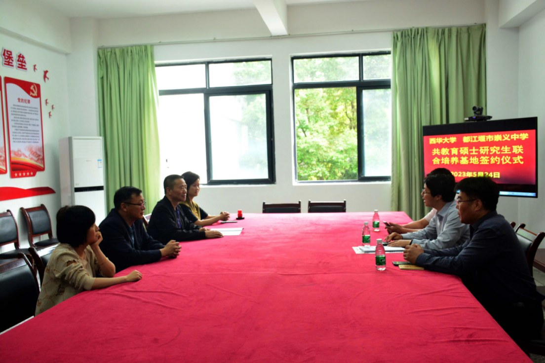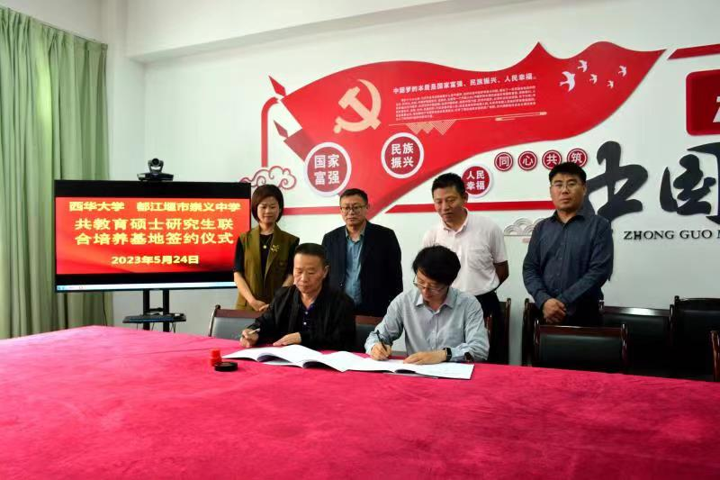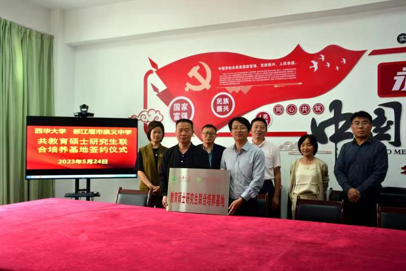 5月24日,西华大学教育硕士研究生联合培养基地签字挂牌仪式在都江堰市崇义中学举行。西华大学心理健康教育中心主任王强、bw西汉姆联副院长王学东、教育硕士专业学位研究生导师代表王方、都江堰市崇义中学党支部书记张久昌、副校长张知钢、刘敏,办公室主任胡茜等参加签字挂牌仪式。