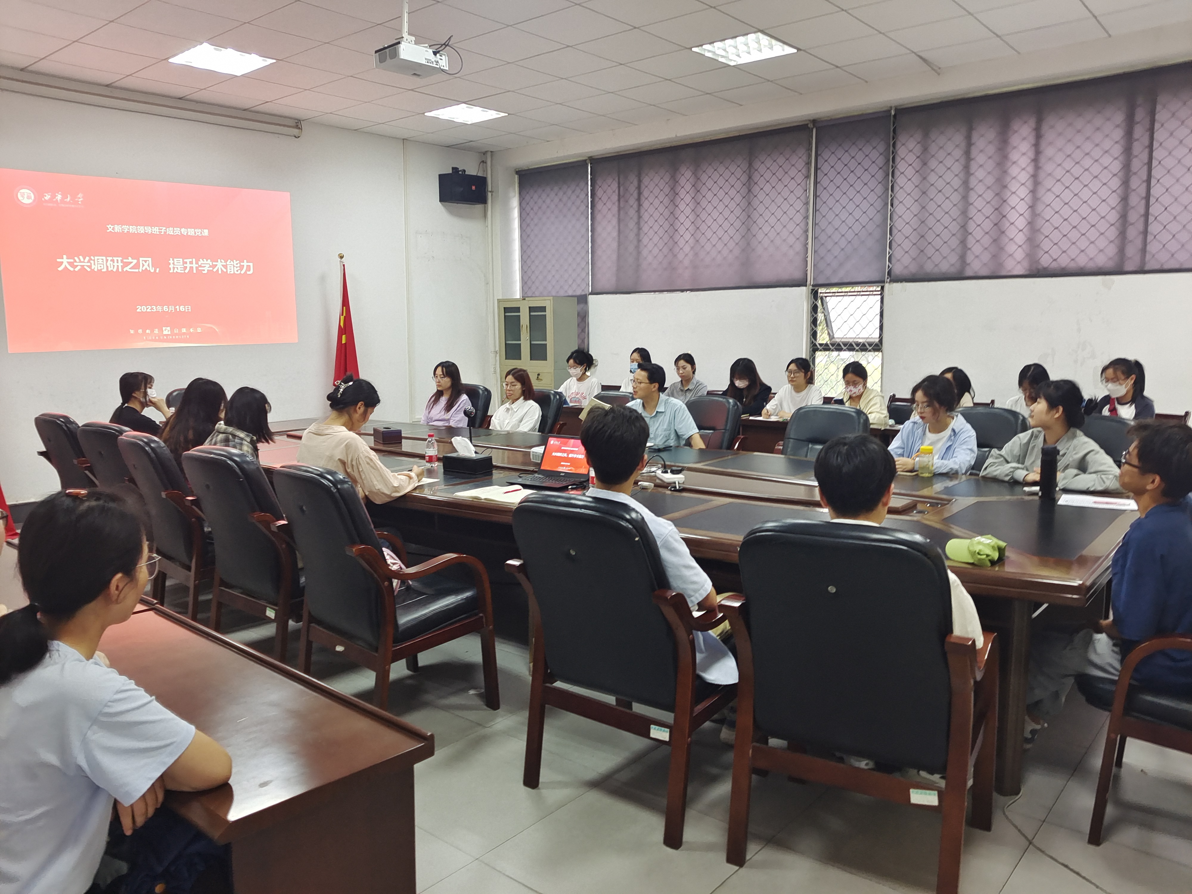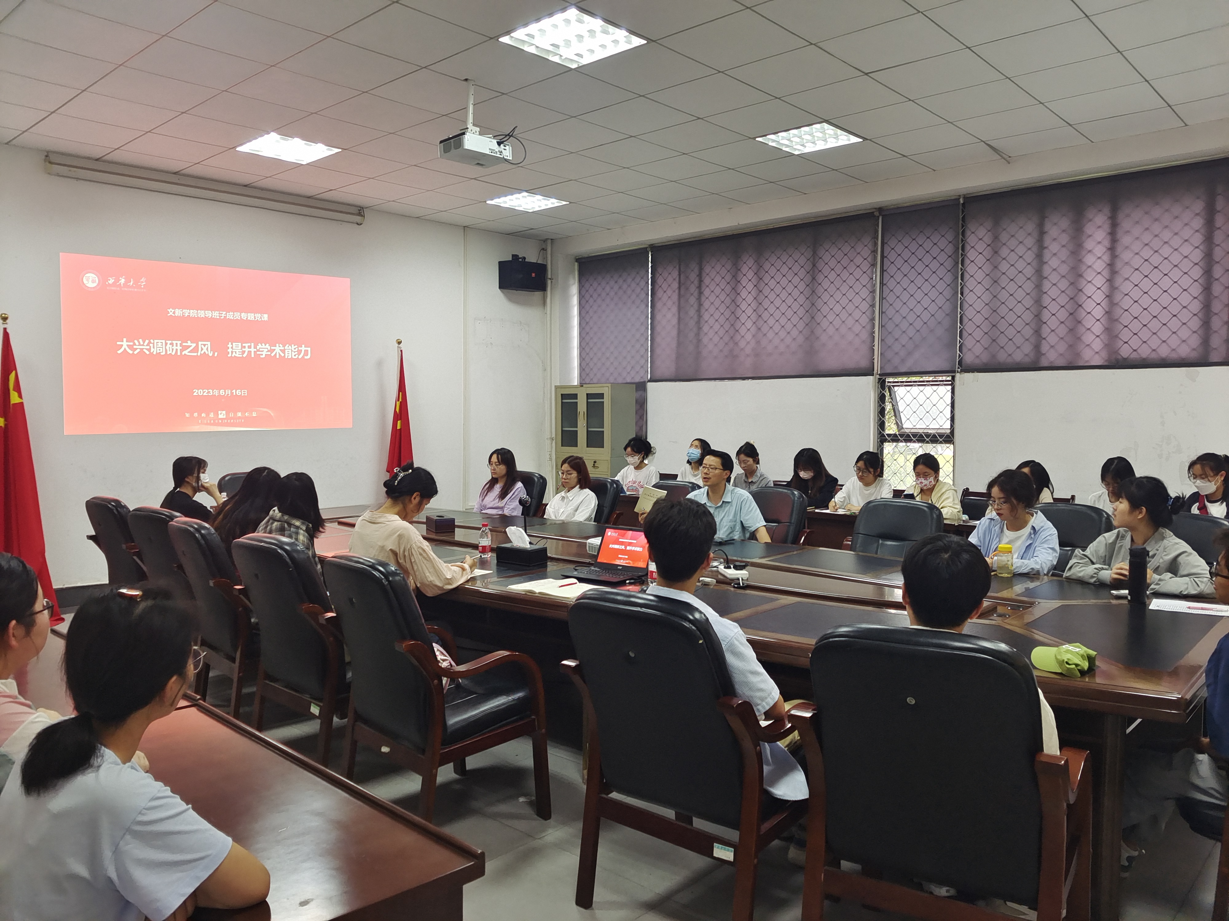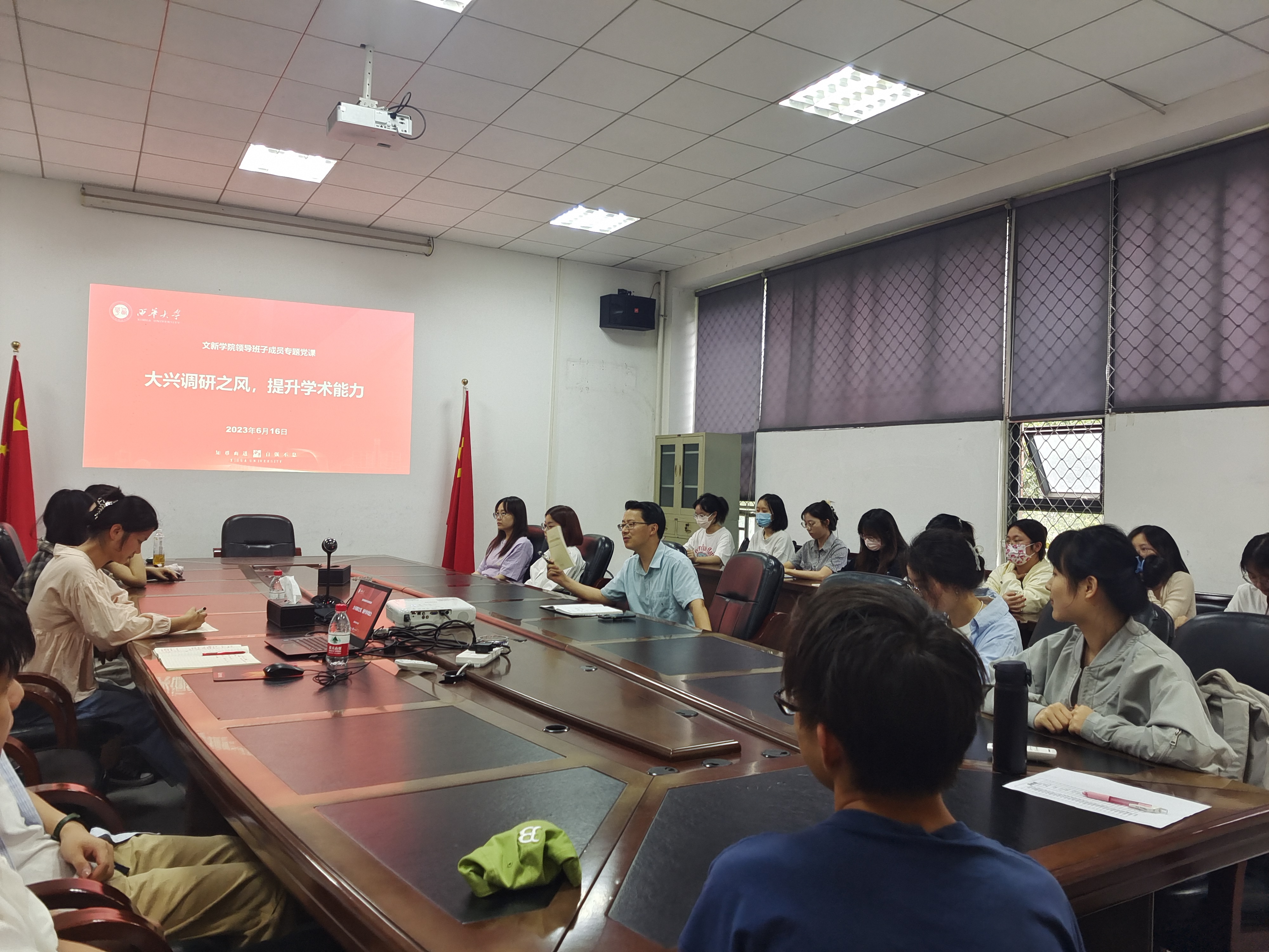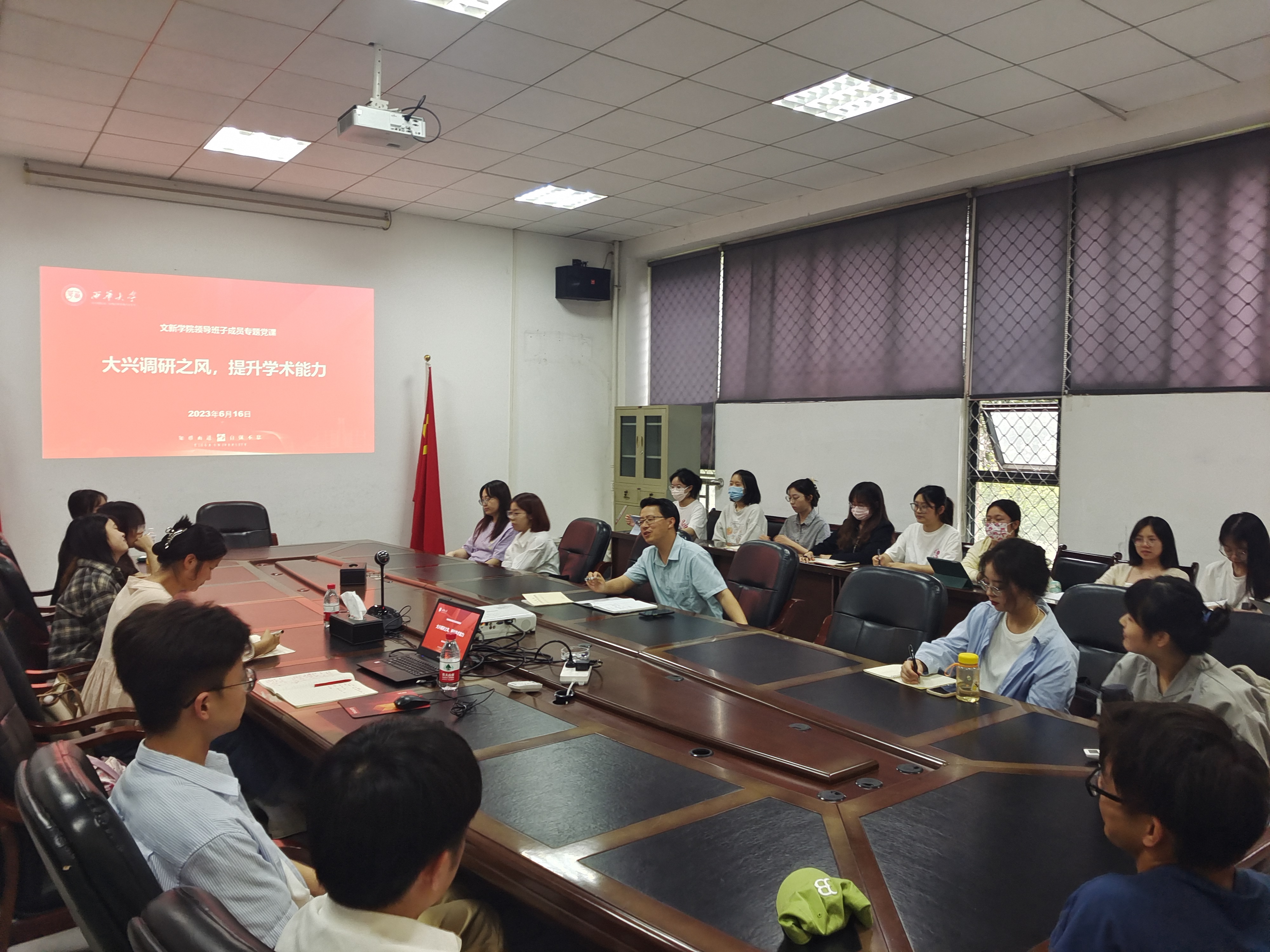 2023年6月16日,西华大学文学与新闻传播学院领导班子成员专题党课正式召开, 此次党课以“大兴调研之风,提升学术能力”为主题,西华大学bw西汉姆联副院长王学东教授围绕调查研究在工作、学习中的重要性、研究生如何聚焦突出矛盾、展开深入研究等问题与线上、线下共60余名研究生展开讨论。本次党课教育旨在表明调研是研究生做好各项工作的基本功,指出研究生在论文写作与调研中的方法与目标,加强研究生与老师之间的学术交流。