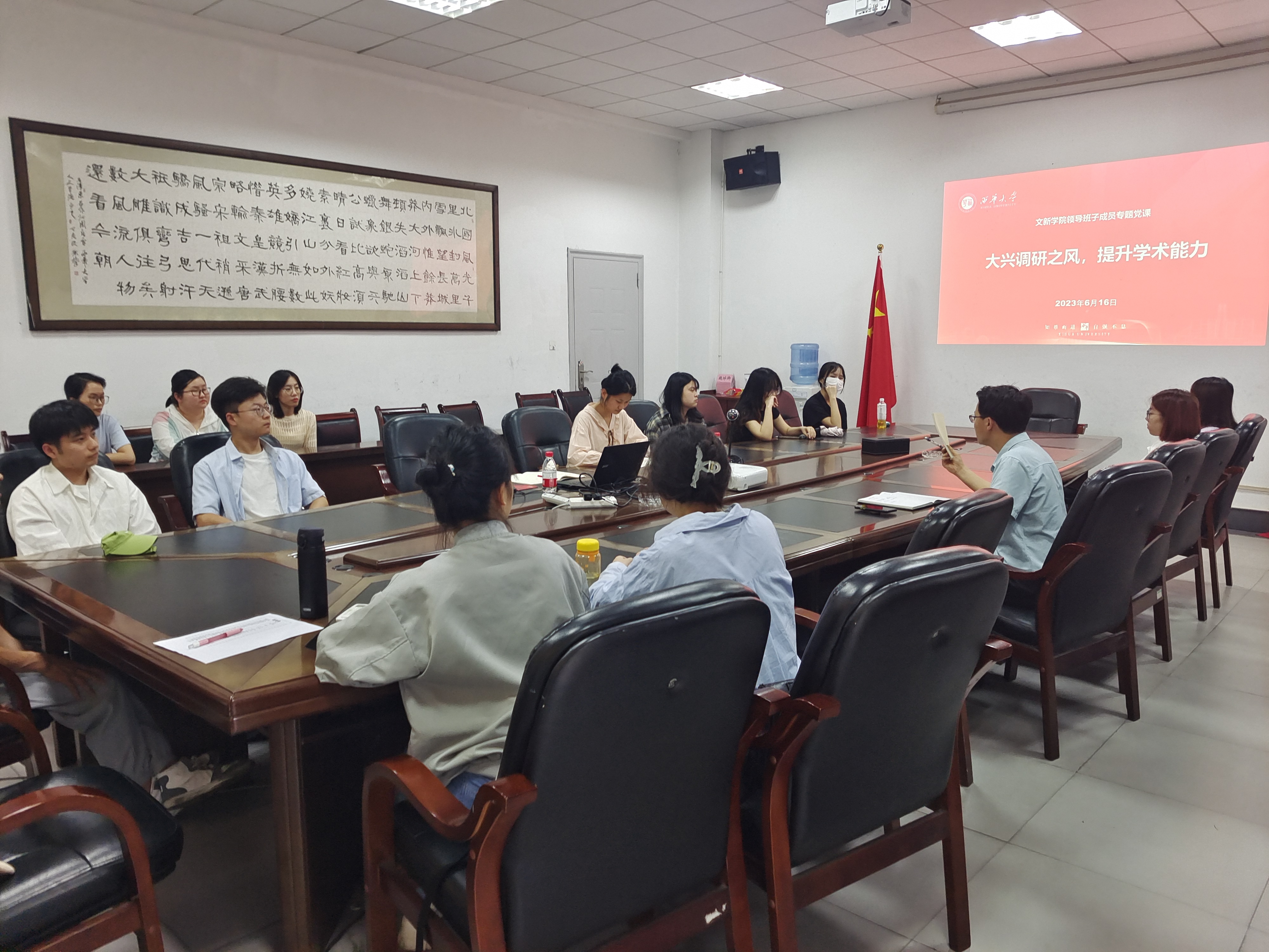 总之,西华大学文新学院“大兴调研之风,提升学术能力”主题党课教育的召开,目标是强调调研在学术中的重要作用,开阔研究生的学术视野,为研究生的论文撰写指明方向,提升研究生的学习效率与学术水平,本次活动为专题党课教育的重要一环,期望对中文系研究生带来思想启迪与有益影响。