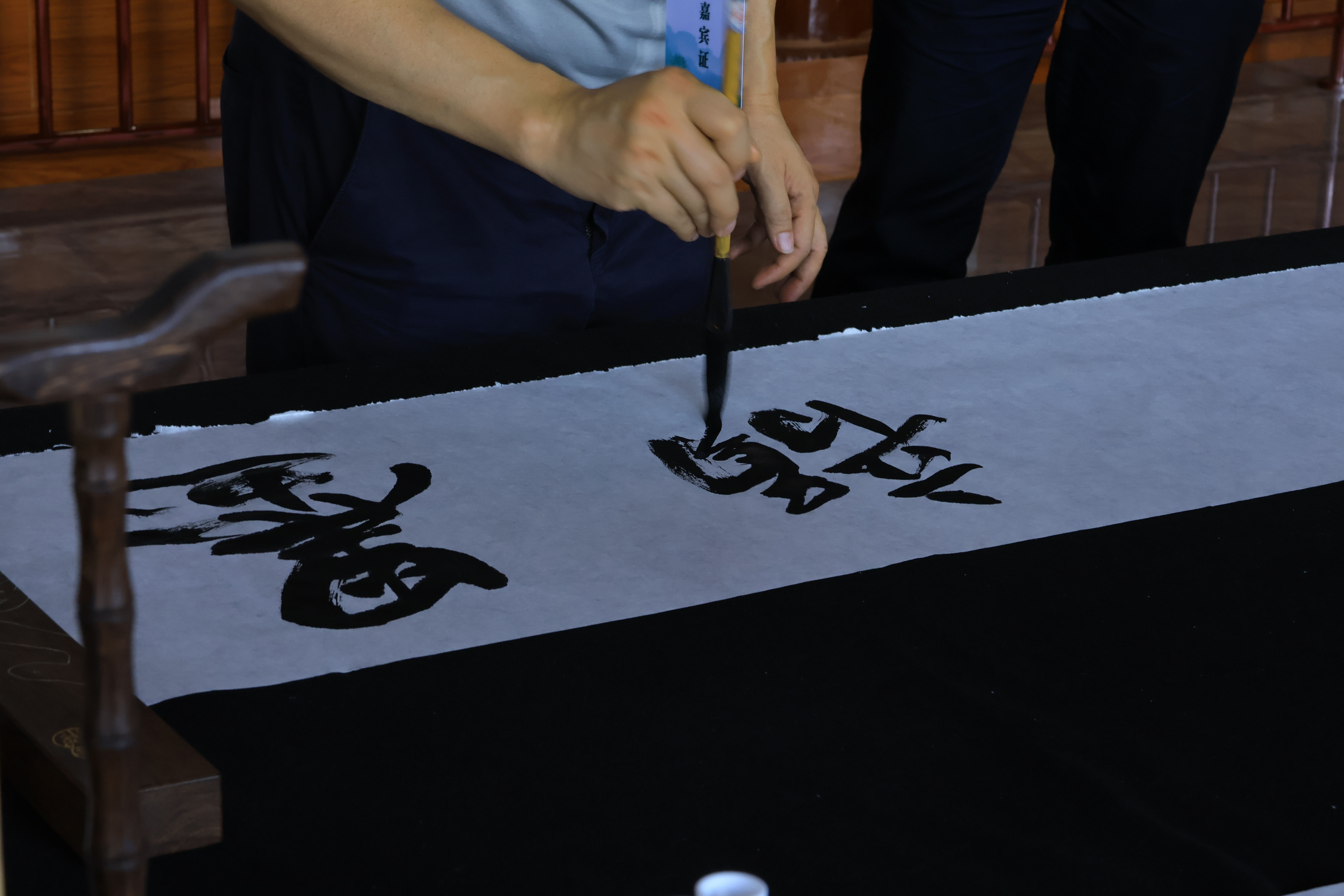 6月19日上午,西华大学师生在蓬溪县教体局机关党委书记刘志军、研学中心主任姜林的引导下前往高峰山景区参观考察。在高峰山,西华大学师生参观了八卦迷宫建筑群,浏览了高峰山保存的名人牌匾,走进孝文化园,观览了养心亭、孝文物展览厅以及中国二十四孝故事浮雕,感受蕴含其中的中国孝文化。在孝文物展览厅,bw西汉姆联党委副书记徐攀受蓬溪县“中国书法之乡”墨香熏染,用厅内的笔墨纸砚留下墨宝,在场同学也纷纷尝试,沉浸在当地浓厚的书法韵味之中。
